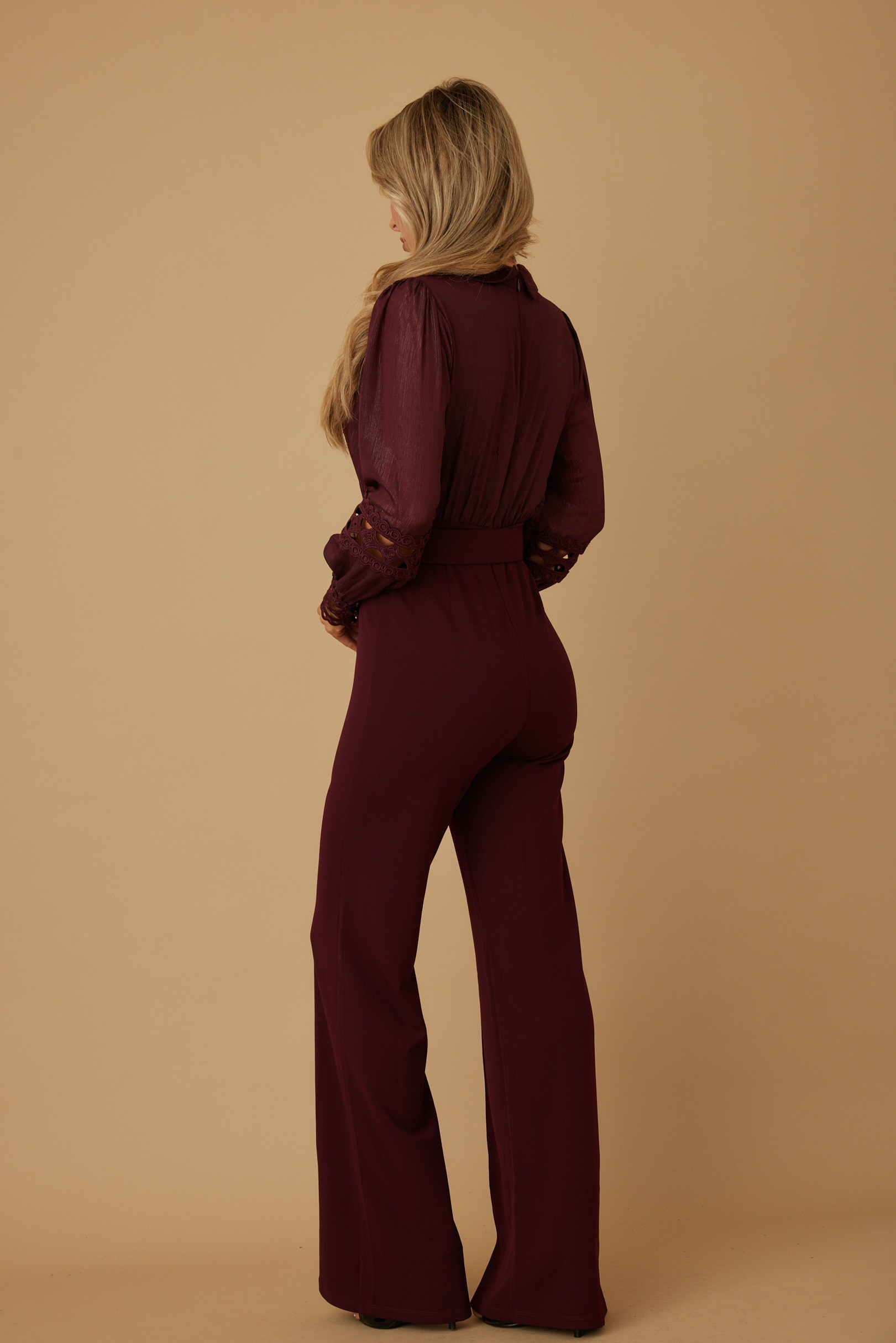 PRODUCT DETAIL - CROCHET DETAILED WOVEN TOP FASHON JUMPSUIT - LONG SLEEVE, BUCKLE HARDWARE BELT DETAIL, ZIPPER IN THE BACK, COLLAR DETAIL CONTENTS & CARE - SELF: 95% POLYESTER 5% SPANDEX/ CONT: 100% POLYESTER - HAND WASH COLD, DO NOT BLEACH, AIR DRY FLAT MODEL IS 5'8" AND WEARING A SIZE SMALL