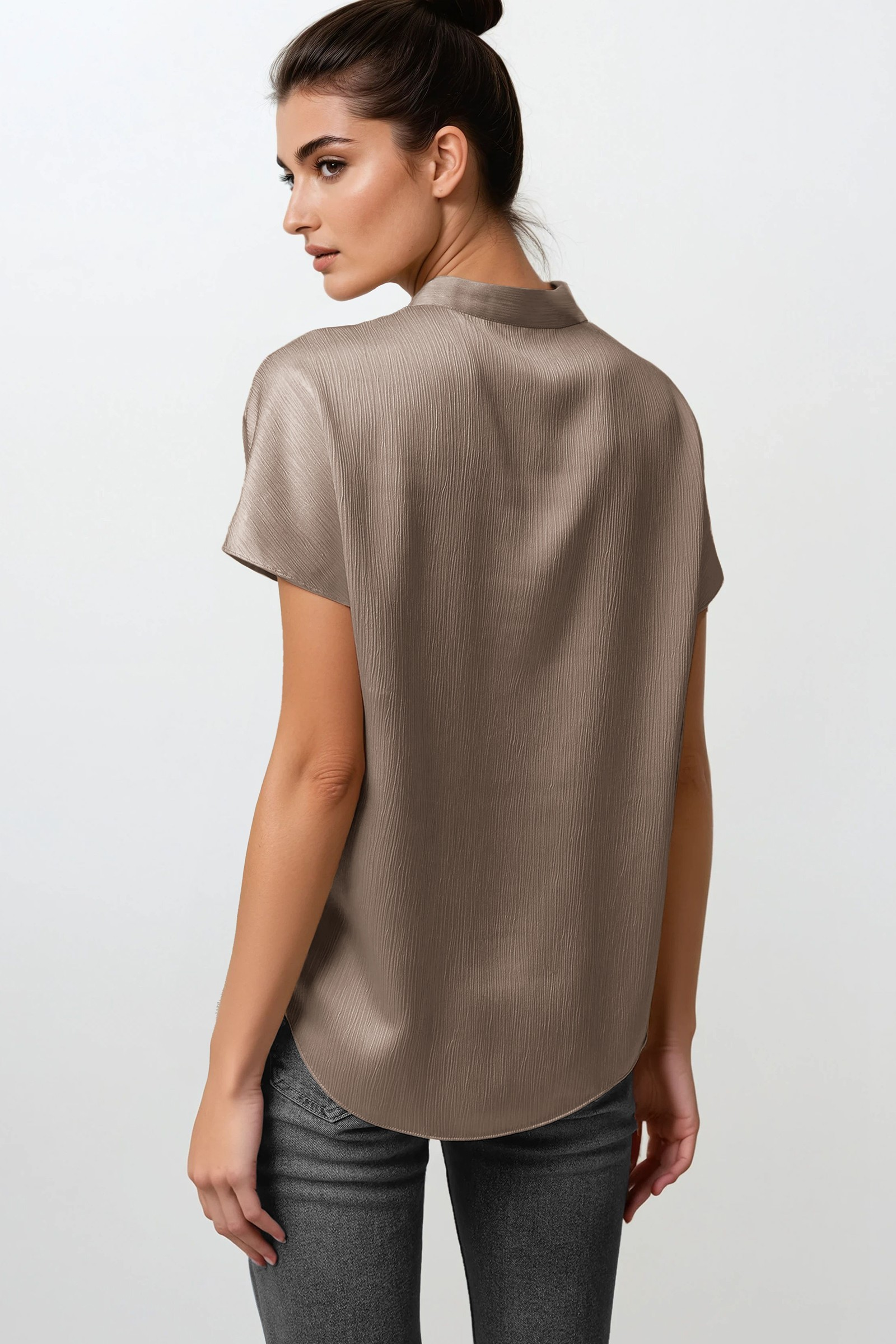 The details: Soft crinkle satin fabric with a relaxed, drop-shoulder fit. Elegant draping for a flattering silhouette. Perfect for both casual and dressy occasions, adding a chic touch to your wardrobe. Versatile and easy to pair with jeans or skirts for an effortlessly stylish look. Model Measurements: Height 5' 9" / 175cm Bust 32" / 81cm Waist 24" / 61cm Hip 35" / 89cm Fabric: Woven 100% Polyester Hand Wash Cold