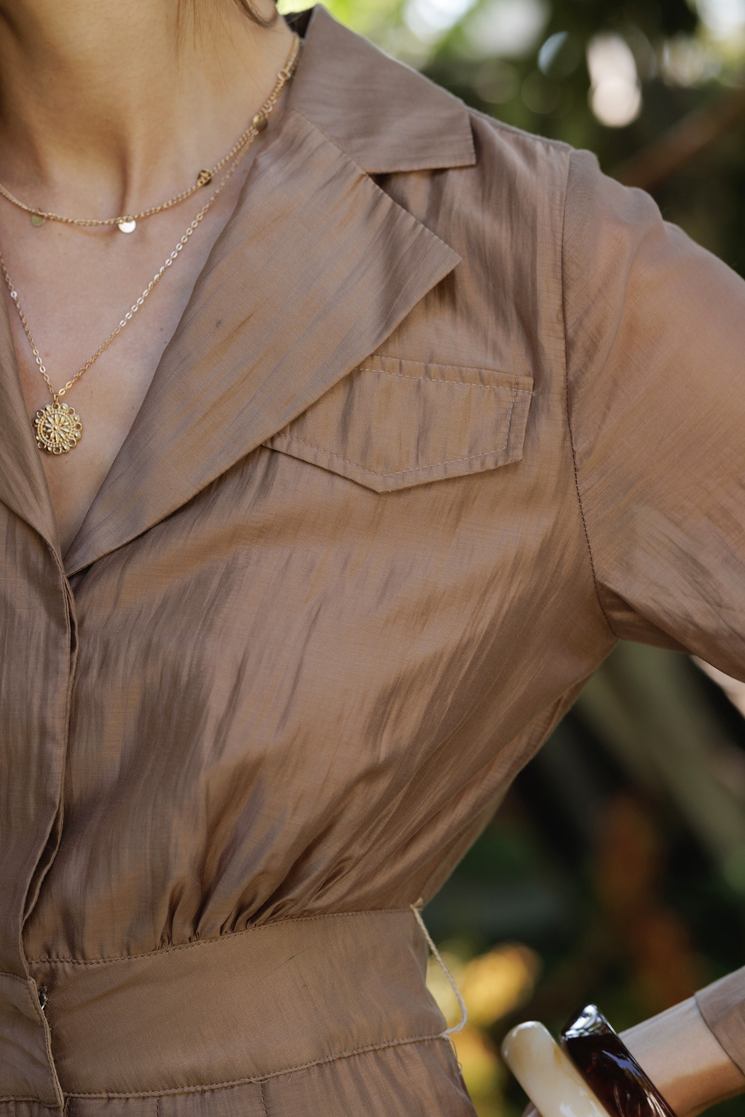 Satin Utility Jumpsuit - Mocha Bronze (Belt Included) Elevate your look with this lightweight, satin-textured utility jumpsuit in a rich mocha-bronze tone. Featuring a soft sheen finish, this full-length silhouette is designed with flattering pleats, utility-style flap pockets, and a wide waistband that creates an elegant, structured shape. Crafted with a flowy drape and semi-sheer long sleeves, it's the perfect piece to take you from day to night. Pair it with heels or wedges for an effortlessly elevated look.