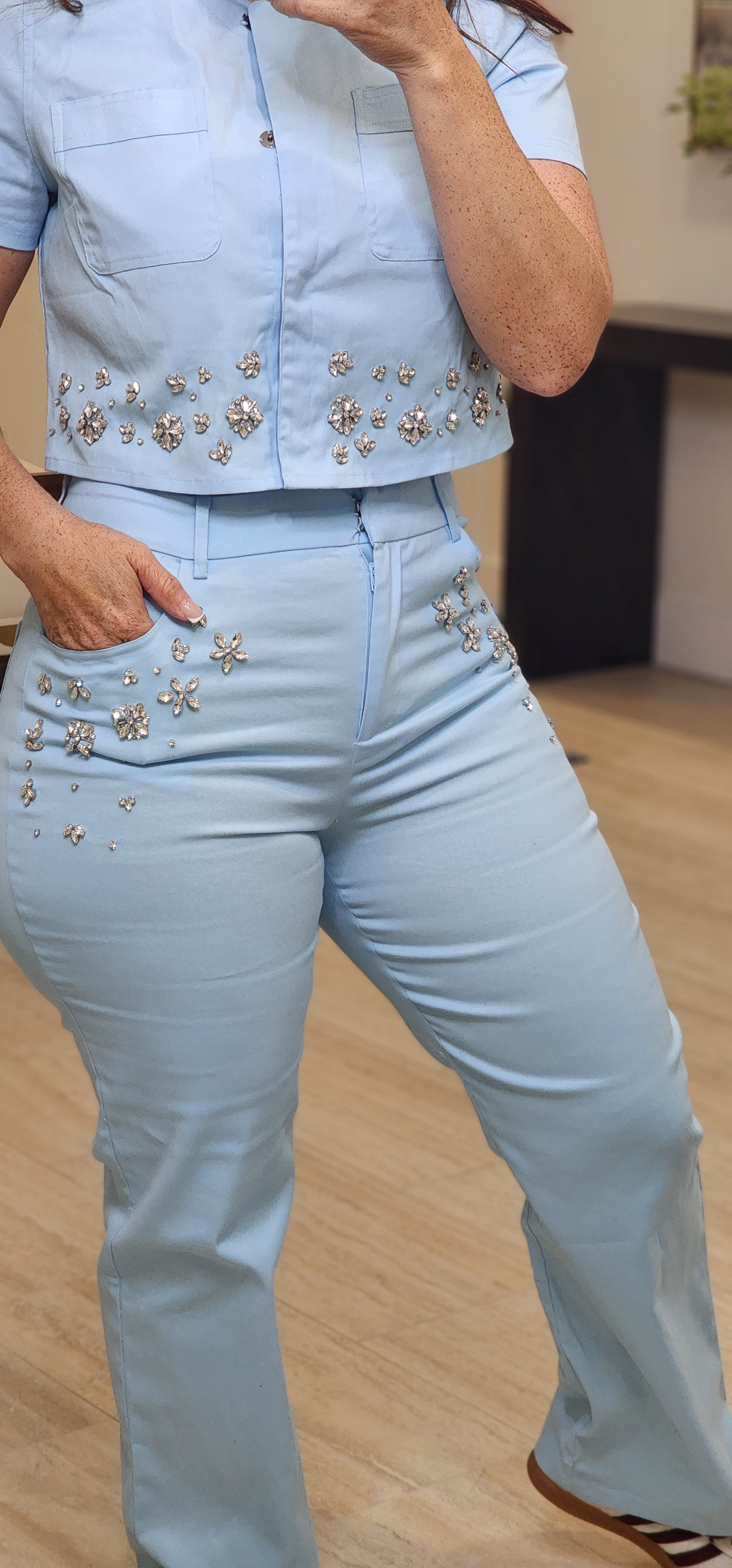 RHINESTONE DENIM PANTS WITH ZIPPER AND HOOK & EYE CLOSURE.